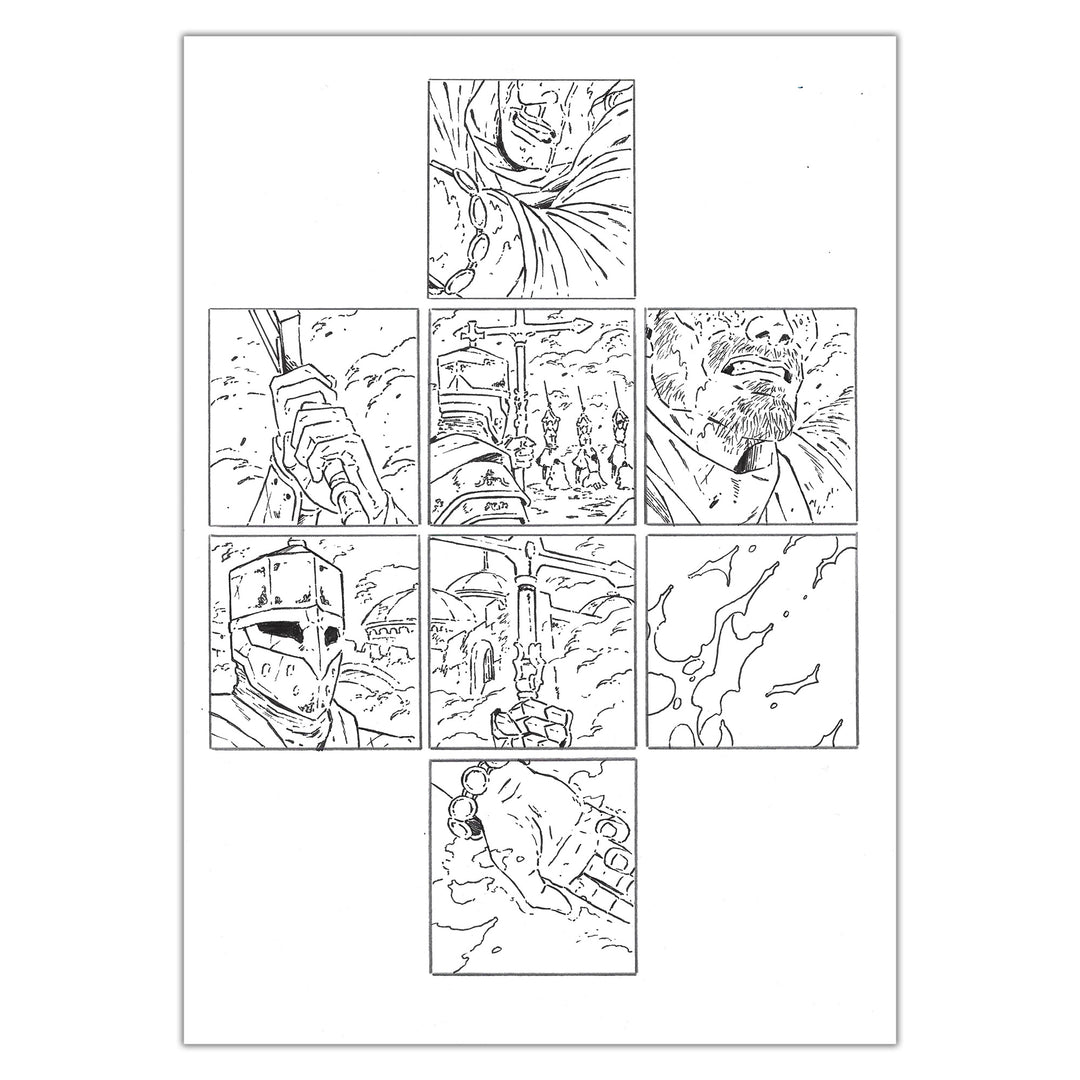 Planche originale n°34 accompagnée de ses 6 étapes préparatoires à la mine de plomb sur calque