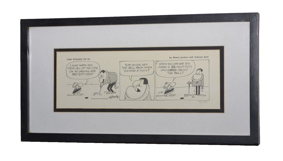 THE WIZARD OF ID 1989 BRANT PARKER & JOHNNY HART GOLF COMIC STRIP ART FRAMED