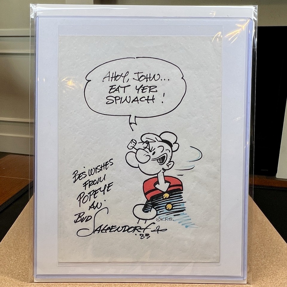 Orig. 3" x 5" SIGNED CARTOON SKETCH OF POPEYE by Bud Sagendorf to Arlene in 1992