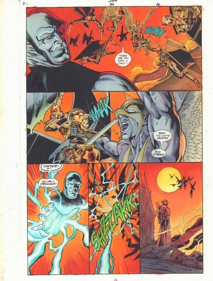 JSA #24 p.16 Color Guide Art - Hawkman and Hawkgirl vs. Onimar by John Kalisz